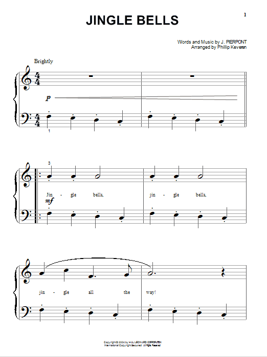 Download or print J. Pierpont Jingle Bells (arr. Phillip Keveren) sheet music, chords and digital score arranged for Beginning Piano Solo. This Children score includes 3 page(s).