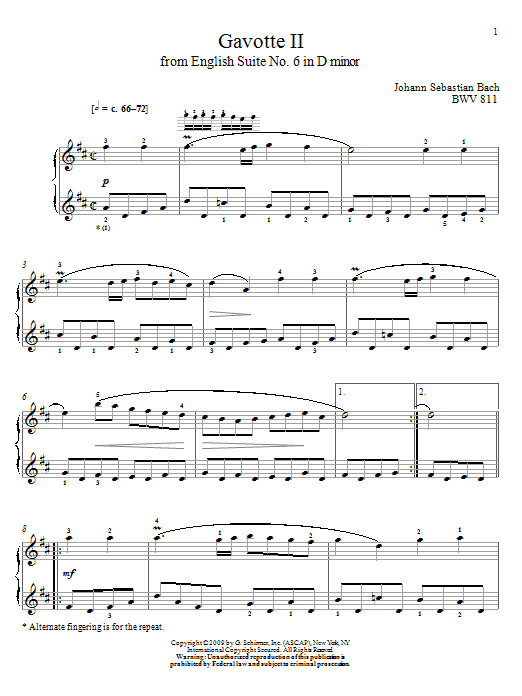 Download or print Johann Sebastian Bach Gavotte II, BWV 811 sheet music, chords and digital score arranged for Piano Solo. This Classical score includes 2 page(s).