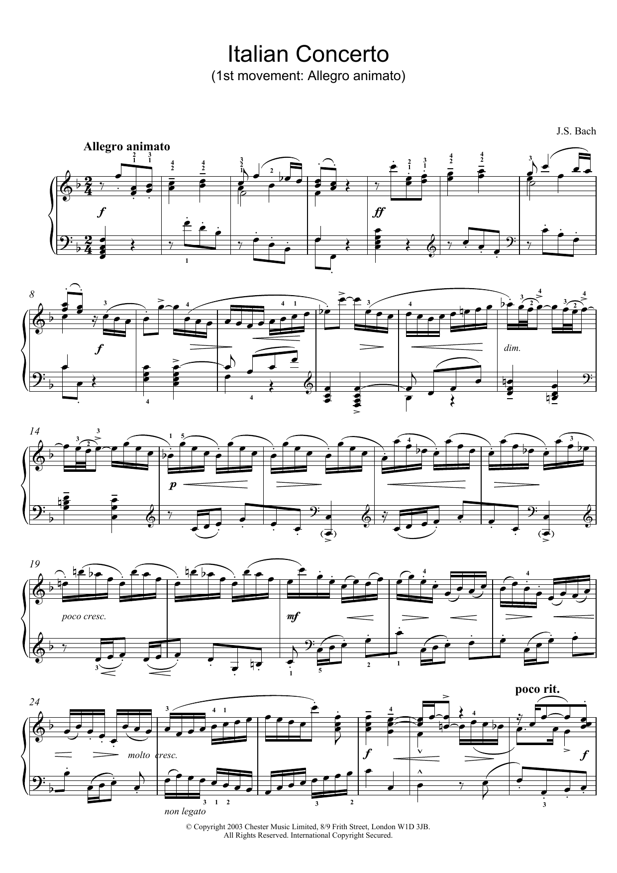 Download or print Johann Sebastian Bach Italian Concerto (1st movement: Allegro animato) sheet music, chords and digital score arranged for Piano Solo. This Classical score includes 7 page(s).