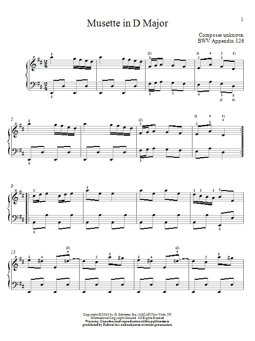 Download or print Johann Sebastian Bach Musette in D Major sheet music, chords and digital score arranged for Piano Solo. This Classical score includes 2 page(s).