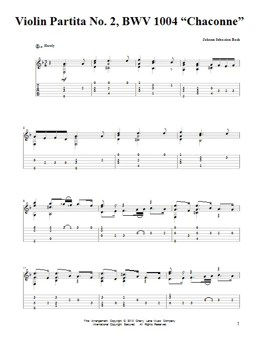 Download or print J.S. Bach Violin Partita No. 2, BWV 1004 "Chaconne" sheet music, chords and digital score arranged for Solo Guitar. This Classical score includes 2 page(s).