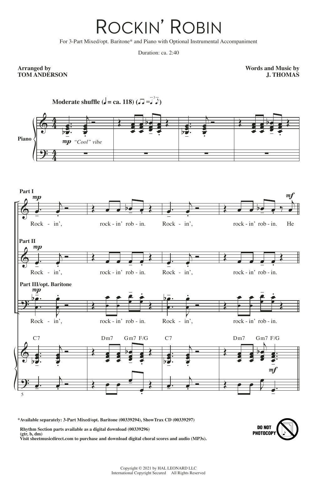 Download or print J. Thomas Rockin' Robin (arr. Tom Anderson) sheet music, chords and digital score arranged for 3-Part Mixed Choir. This Concert score includes 10 page(s).