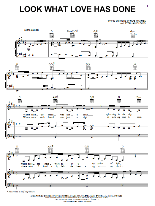 Download or print Jaci Velasquez Look What Love Has Done sheet music, chords and digital score arranged for Piano, Vocal & Guitar Chords (Right-Hand Melody). This Christian score includes 4 page(s).