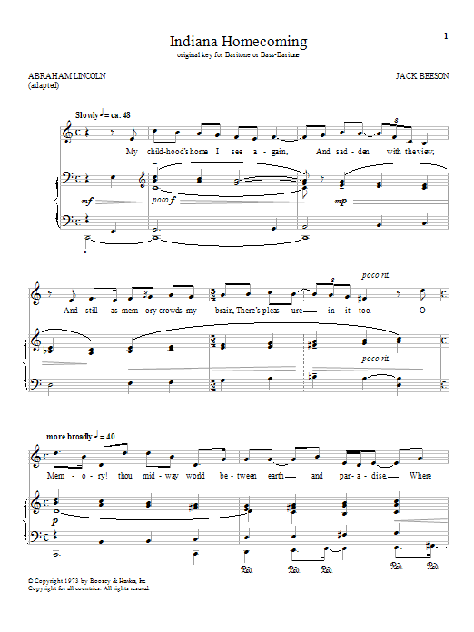 Download or print Jack Beeson Indiana Homecoming sheet music, chords and digital score arranged for Piano & Vocal. This Classical score includes 3 page(s).