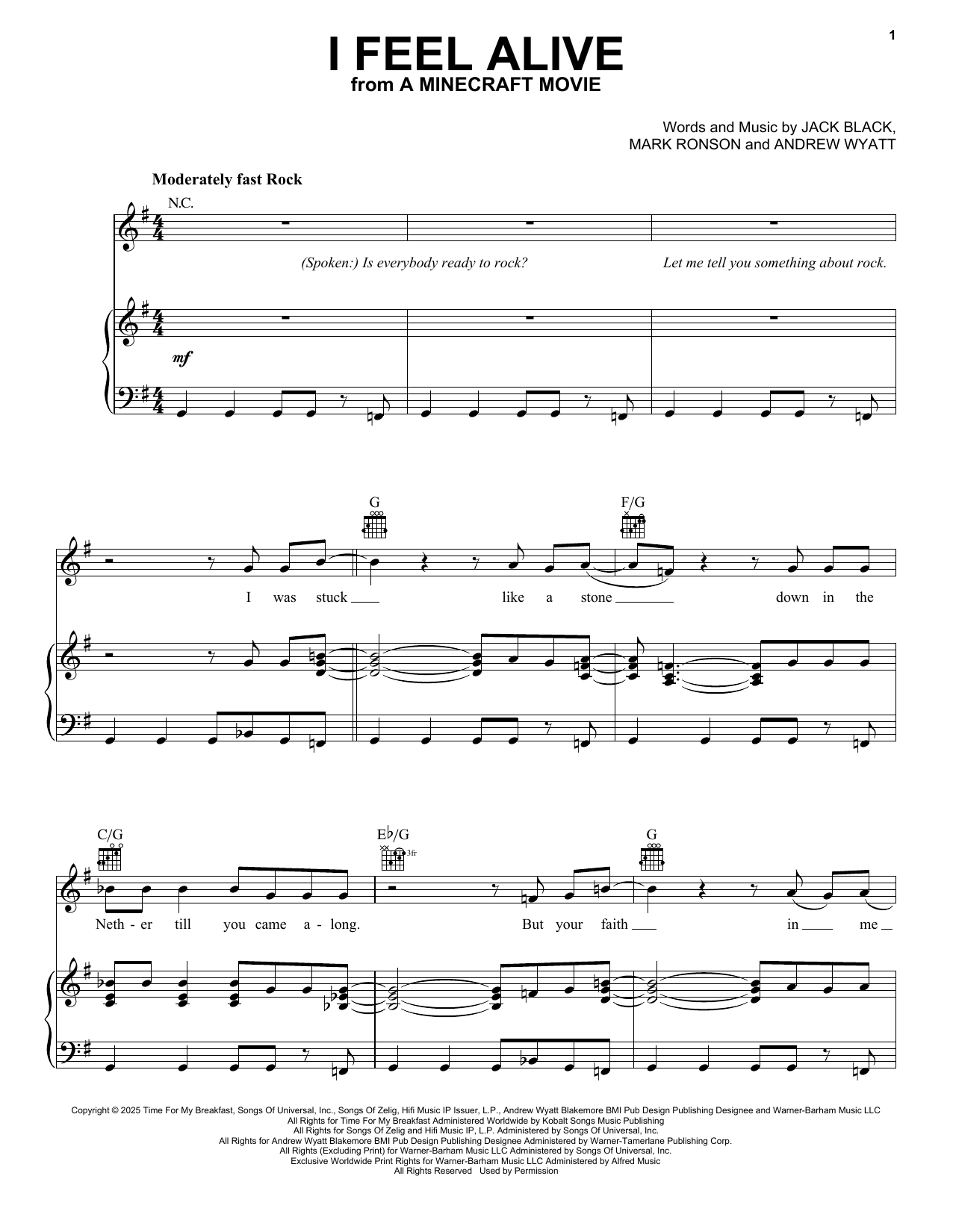 Download or print Jack Black I Feel Alive (from A Minecraft Movie) sheet music, chords and digital score arranged for Piano, Vocal & Guitar Chords (Right-Hand Melody). This Pop score includes 8 page(s).