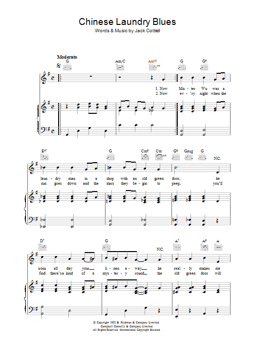 Download or print Jack Cottrell Chinese Laundry Blues sheet music, chords and digital score arranged for Piano, Vocal & Guitar Chords. This Blues score includes 6 page(s).
