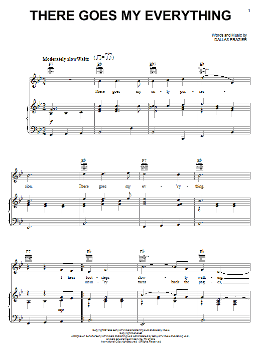 Download or print Jack Greene There Goes My Everything sheet music, chords and digital score arranged for Piano, Vocal & Guitar Chords (Right-Hand Melody). This Country score includes 4 page(s).