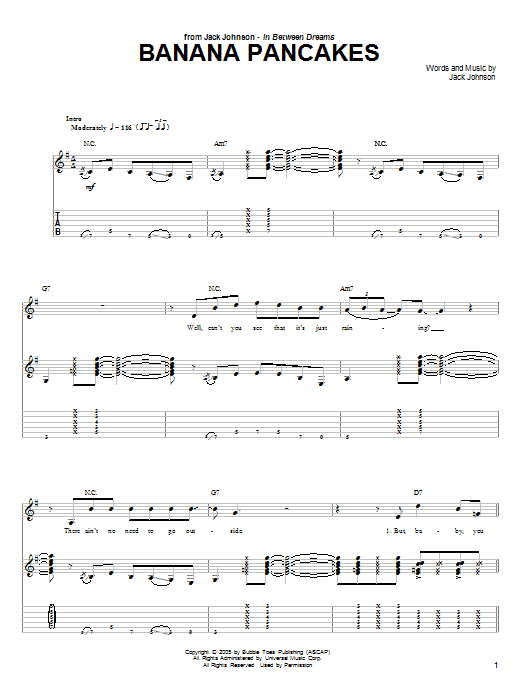 Download or print Jack Johnson Banana Pancakes sheet music, chords and digital score arranged for Guitar Tab. This Folk score includes 6 page(s).