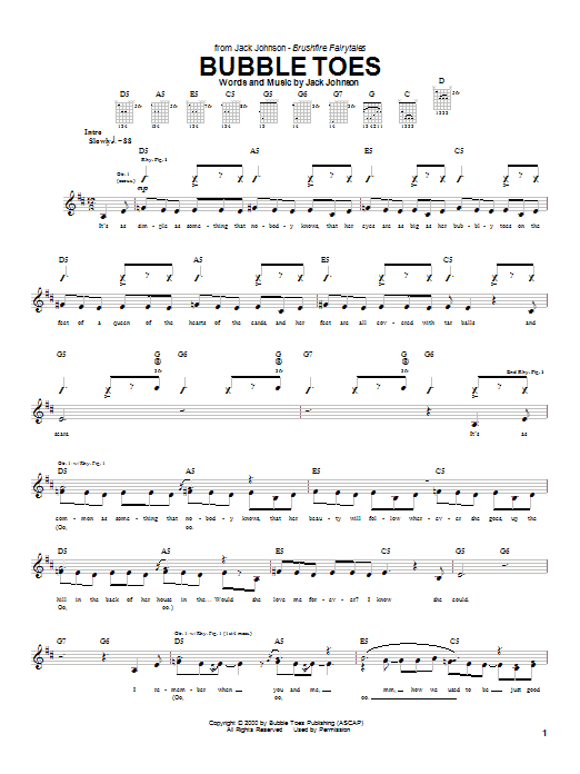 Download or print Jack Johnson Bubble Toes sheet music, chords and digital score arranged for Piano, Vocal & Guitar Chords (Right-Hand Melody). This Folk score includes 8 page(s).
