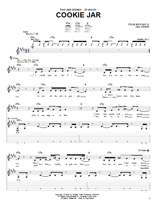 Download or print Jack Johnson Cookie Jar sheet music, chords and digital score arranged for Piano, Vocal & Guitar Chords (Right-Hand Melody). This Pop score includes 6 page(s).