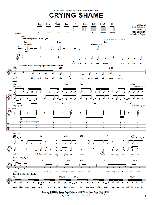Download or print Jack Johnson Crying Shame sheet music, chords and digital score arranged for Guitar Chords/Lyrics. This Rock score includes 4 page(s).