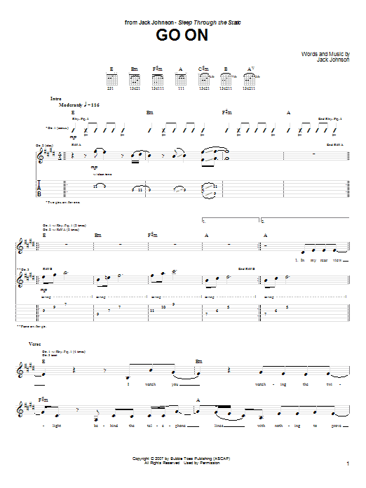Download or print Jack Johnson Go On sheet music, chords and digital score arranged for Easy Piano. This Rock score includes 6 page(s).