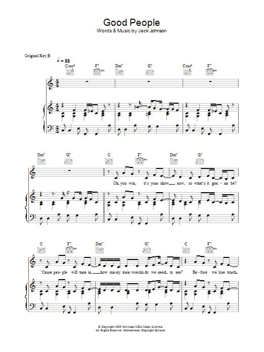 Download or print Jack Johnson Good People sheet music, chords and digital score arranged for Piano, Vocal & Guitar Chords. This Folk score includes 8 page(s).