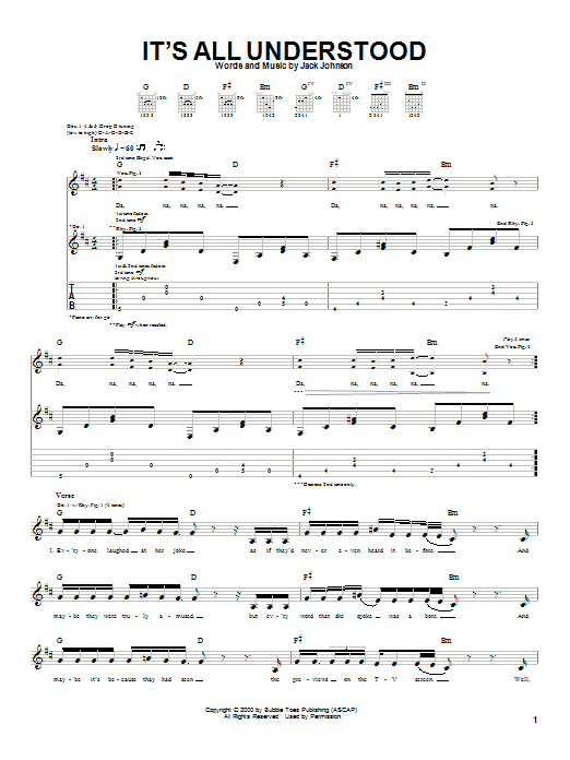 Download or print Jack Johnson It's All Understood sheet music, chords and digital score arranged for Guitar Tab. This Pop score includes 5 page(s).
