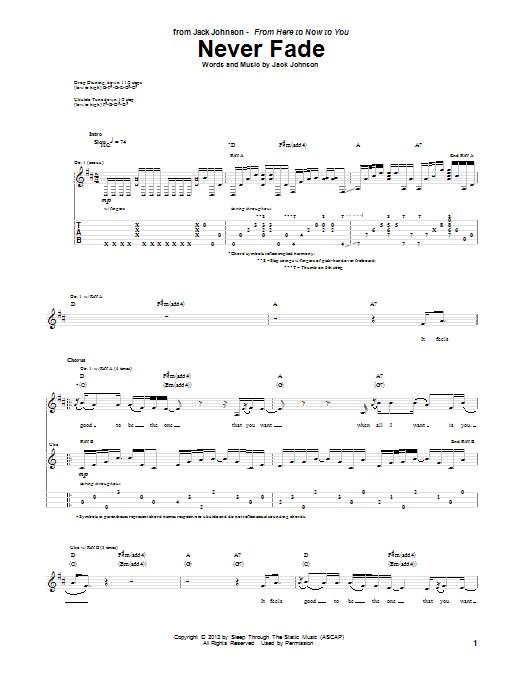 Download or print Jack Johnson Never Fade sheet music, chords and digital score arranged for Guitar Tab. This Pop score includes 5 page(s).