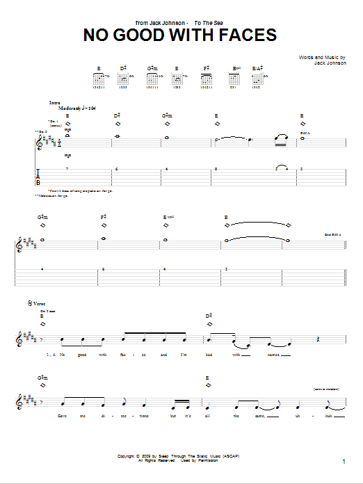 Download or print Jack Johnson No Good With Faces sheet music, chords and digital score arranged for Guitar Tab. This Pop score includes 5 page(s).