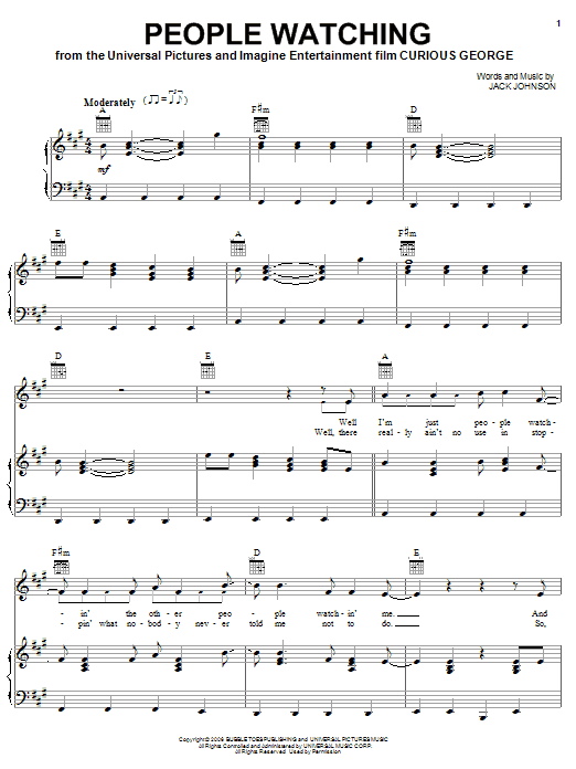 Download or print Jack Johnson People Watching sheet music, chords and digital score arranged for Piano, Vocal & Guitar Chords (Right-Hand Melody). This Children score includes 6 page(s).
