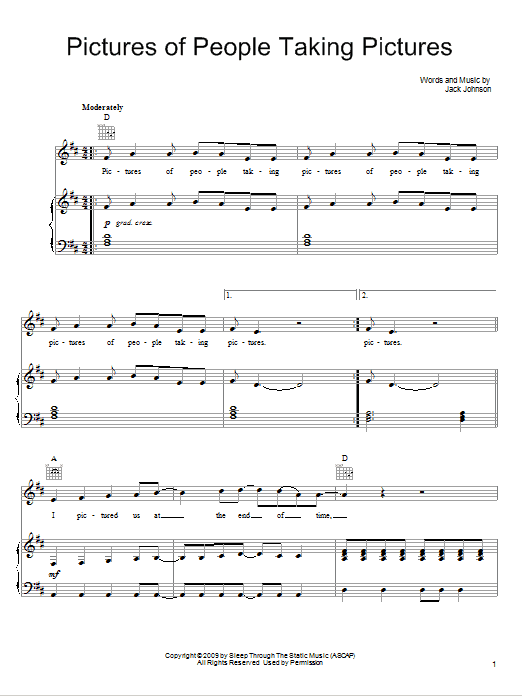 Download or print Jack Johnson Pictures Of People Taking Pictures sheet music, chords and digital score arranged for Piano, Vocal & Guitar Chords (Right-Hand Melody). This Pop score includes 6 page(s).