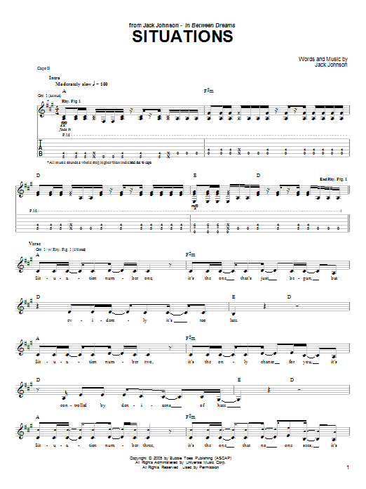 Download or print Jack Johnson Situations sheet music, chords and digital score arranged for Guitar Chords/Lyrics. This Rock score includes 1 page(s).