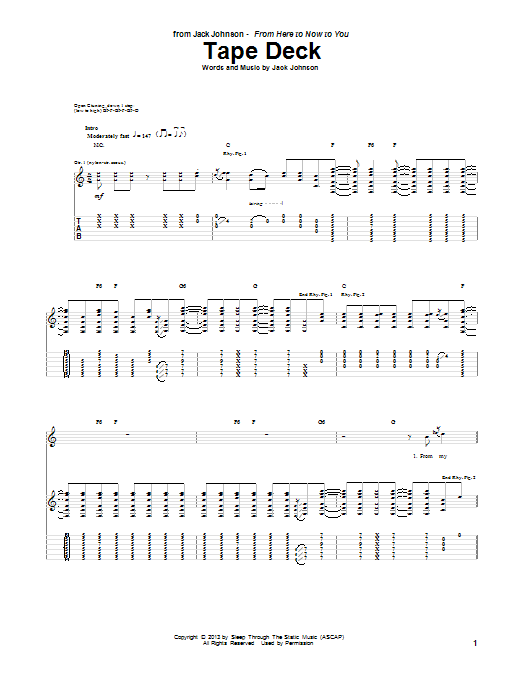 Download or print Jack Johnson Tape Deck sheet music, chords and digital score arranged for Guitar Tab. This Pop score includes 6 page(s).