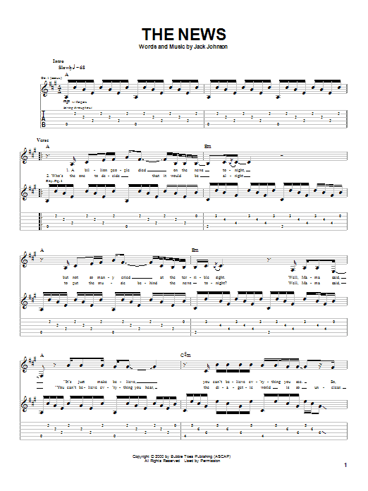 Download or print Jack Johnson The News sheet music, chords and digital score arranged for Guitar Tab. This Pop score includes 3 page(s).