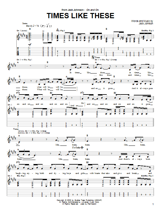 Download or print Jack Johnson Times Like These sheet music, chords and digital score arranged for Easy Piano. This Pop score includes 4 page(s).