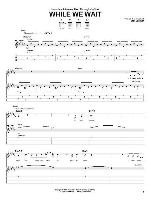 Download or print Jack Johnson While We Wait sheet music, chords and digital score arranged for Guitar Tab. This Pop score includes 2 page(s).