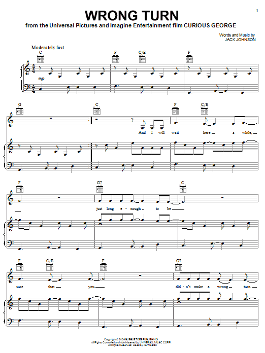 Download or print Jack Johnson Wrong Turn sheet music, chords and digital score arranged for Piano, Vocal & Guitar Chords (Right-Hand Melody). This Children score includes 7 page(s).