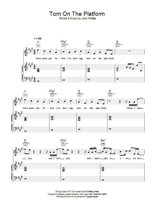 Download or print Jack Peñate Torn On The Platform sheet music, chords and digital score arranged for Guitar Chords/Lyrics. This Rock score includes 3 page(s).