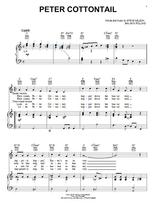 Download or print Steve Nelson Peter Cottontail sheet music, chords and digital score arranged for Piano, Vocal & Guitar Chords (Right-Hand Melody). This Children score includes 3 page(s).
