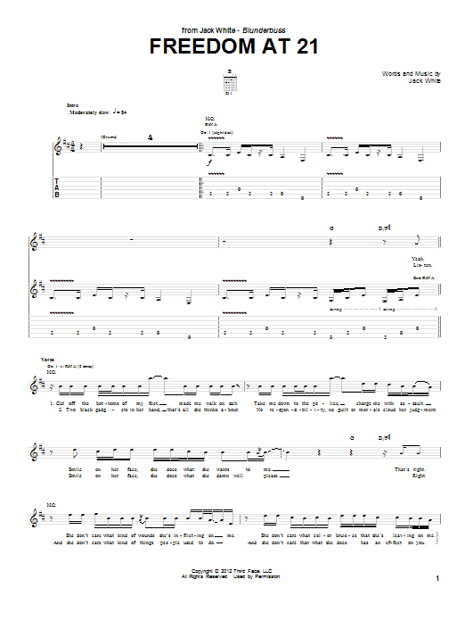 Download or print Jack White Freedom At 21 sheet music, chords and digital score arranged for Guitar Tab. This Pop score includes 5 page(s).