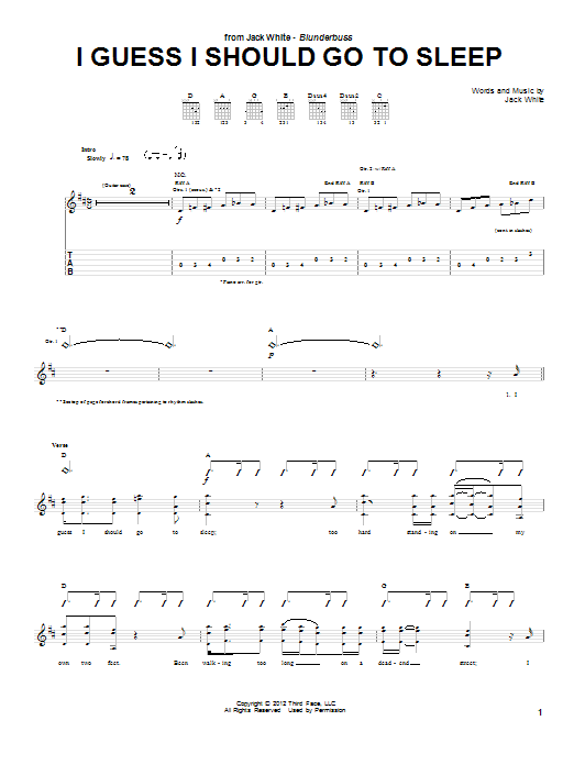 Download or print Jack White I Guess I Should Go To Sleep sheet music, chords and digital score arranged for Guitar Tab. This Pop score includes 4 page(s).