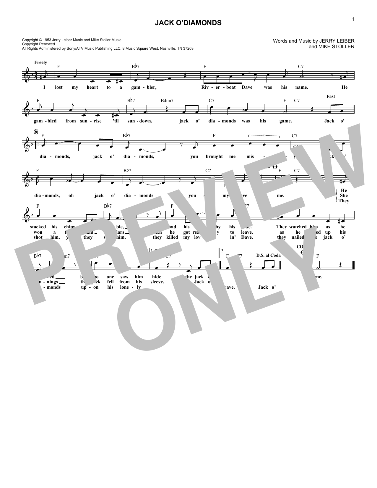 Download or print Jacki Fontaine Jack O'Diamonds sheet music, chords and digital score arranged for Lead Sheet / Fake Book. This Pop score includes 1 page(s).