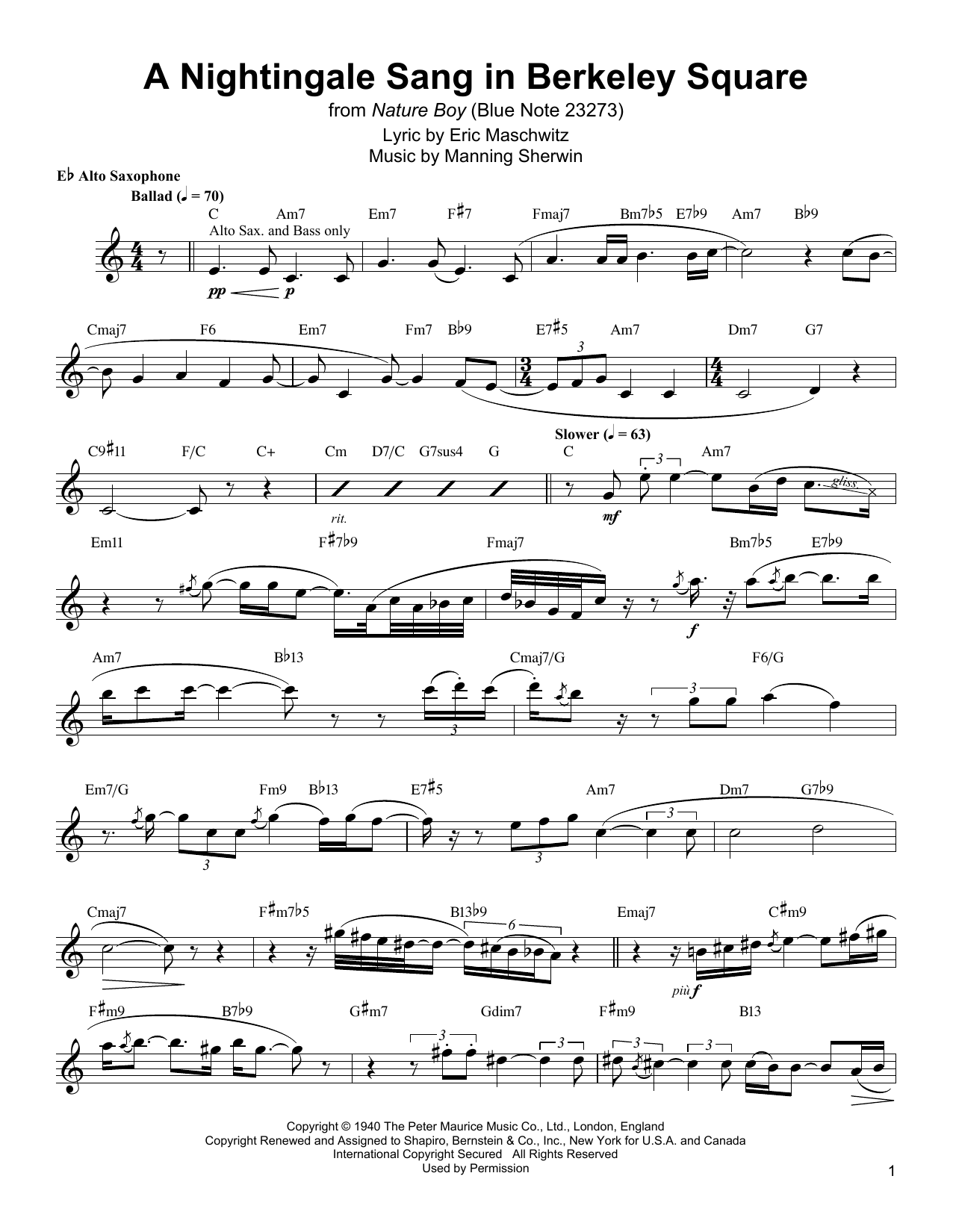 Download or print Jackie McLean A Nightingale Sang In Berkeley Square sheet music, chords and digital score arranged for Alto Sax Transcription. This Jazz score includes 5 page(s).