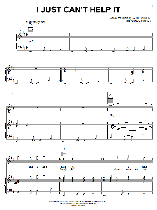 Download or print Jackie Wilson I Just Can't Help It sheet music, chords and digital score arranged for Piano, Vocal & Guitar Chords (Right-Hand Melody). This Pop score includes 6 page(s).