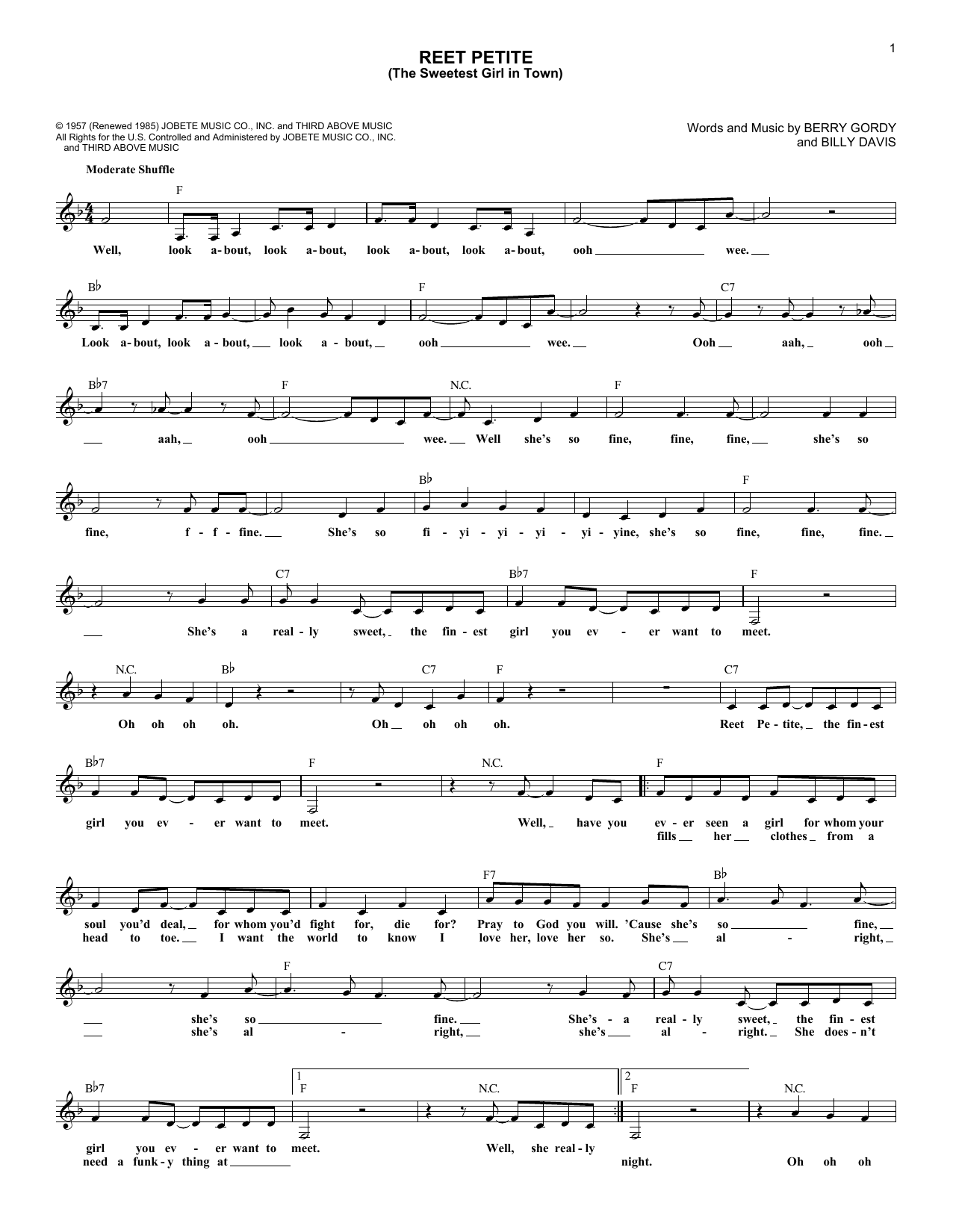 Download or print Jackie Wilson Reet Petite (The Sweetest Girl In Town) sheet music, chords and digital score arranged for Lead Sheet / Fake Book. This Rock score includes 2 page(s).
