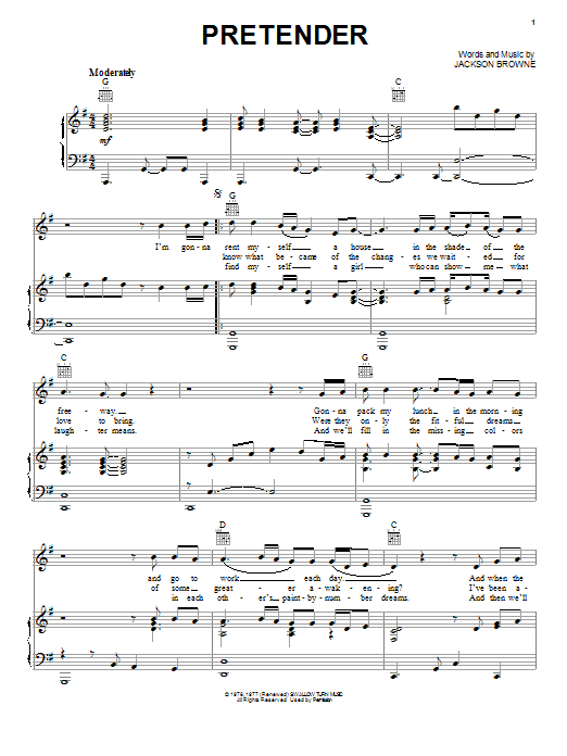 Download or print Jackson Browne Pretender sheet music, chords and digital score arranged for Piano, Vocal & Guitar Chords (Right-Hand Melody). This Pop score includes 8 page(s).