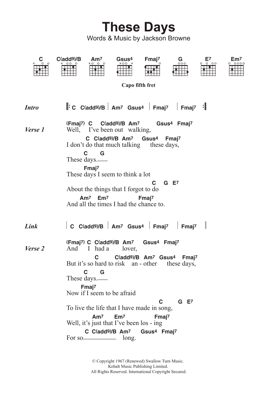 Download or print Jackson Browne These Days sheet music, chords and digital score arranged for Guitar Chords/Lyrics. This Pop score includes 2 page(s).