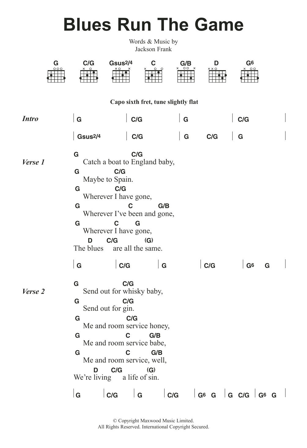 Download or print Jackson Frank Blues Run The Game sheet music, chords and digital score arranged for Guitar Chords/Lyrics. This Blues score includes 3 page(s).