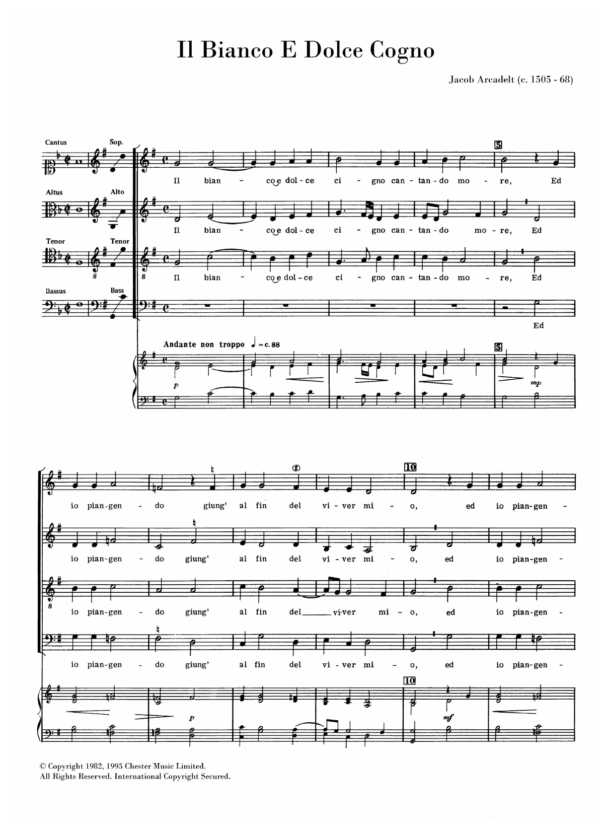 Download or print Jacob Arcadelt Il Bianco E Dolce Cigno sheet music, chords and digital score arranged for SATB Choir. This Classical score includes 3 page(s).