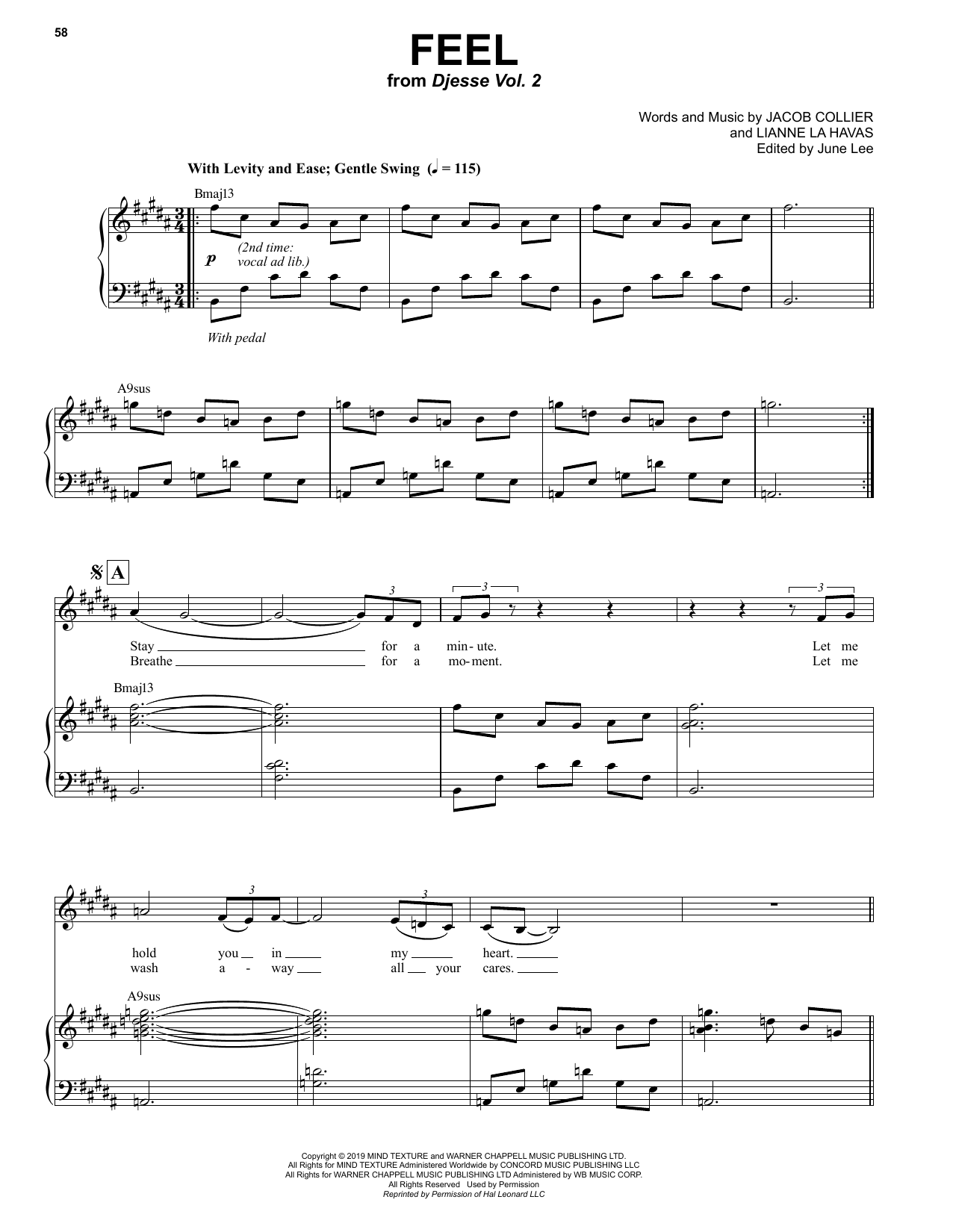 Download or print Jacob Collier Feel (feat. Lianne La Havas) sheet music, chords and digital score arranged for Piano & Vocal. This Jazz score includes 7 page(s).