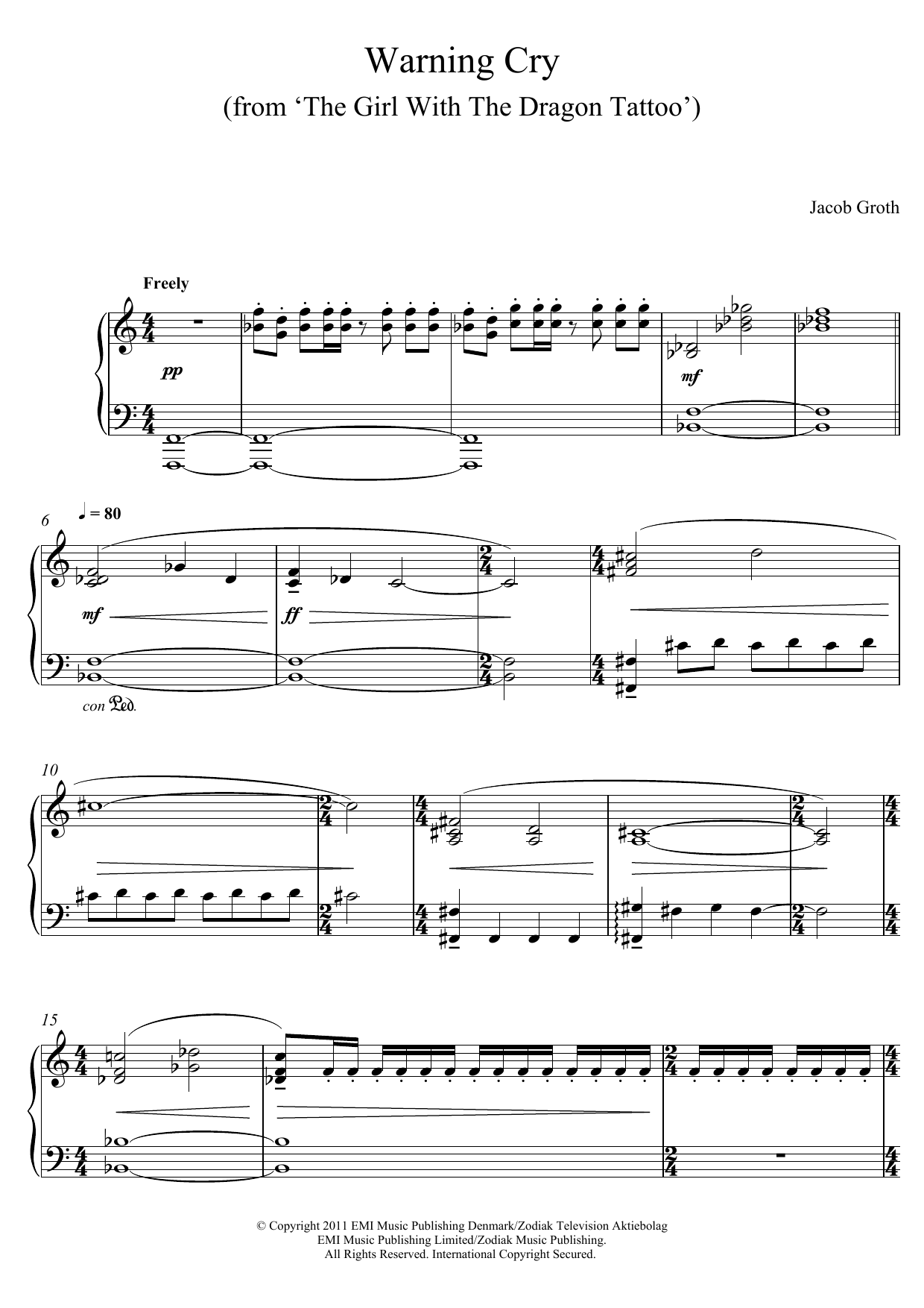 Download or print Jacob Groth Warning Cry (From 'The Girl With A Dragon Tattoo') sheet music, chords and digital score arranged for Piano Solo. This Film/TV score includes 5 page(s).