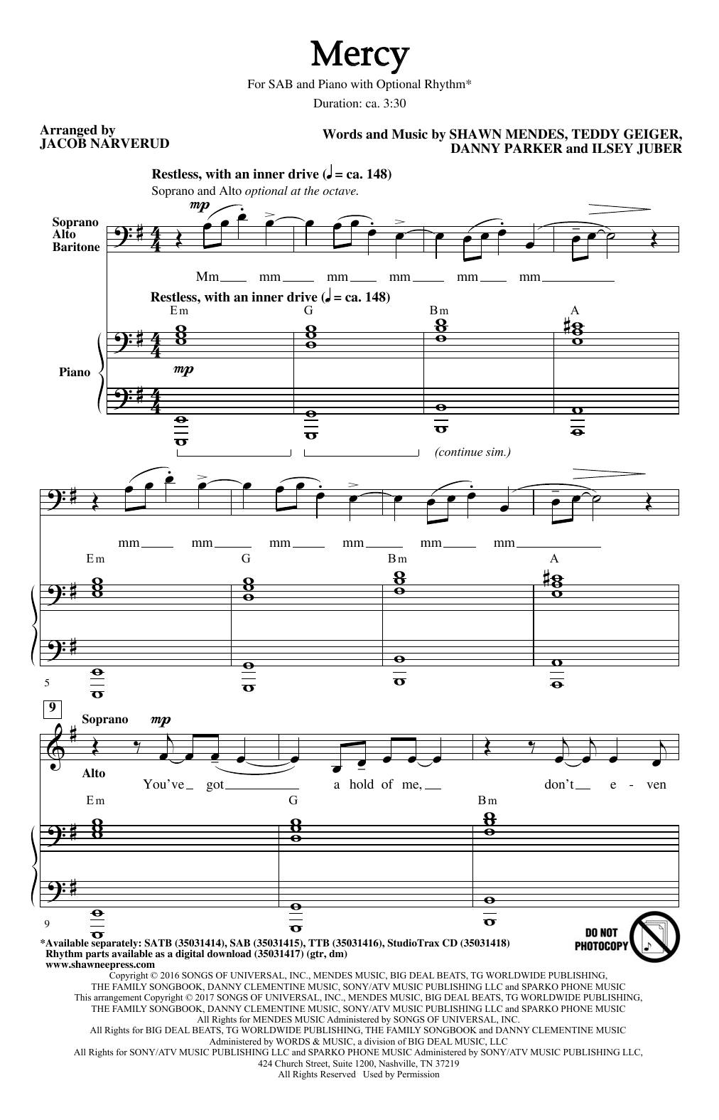 Download or print Shawn Mendes Mercy (arr. Jacob Narverud) sheet music, chords and digital score arranged for SAB Choir. This Pop score includes 19 page(s).
