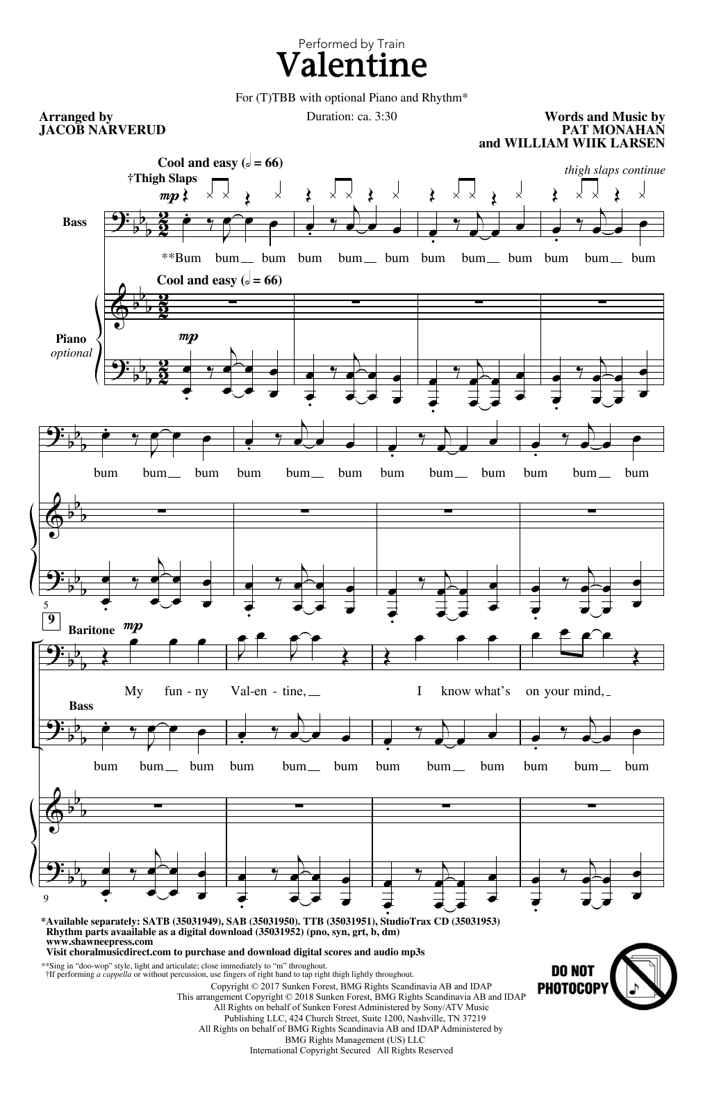 Download or print Jacob Narverud Valentine sheet music, chords and digital score arranged for SAB Choir. This Pop score includes 17 page(s).