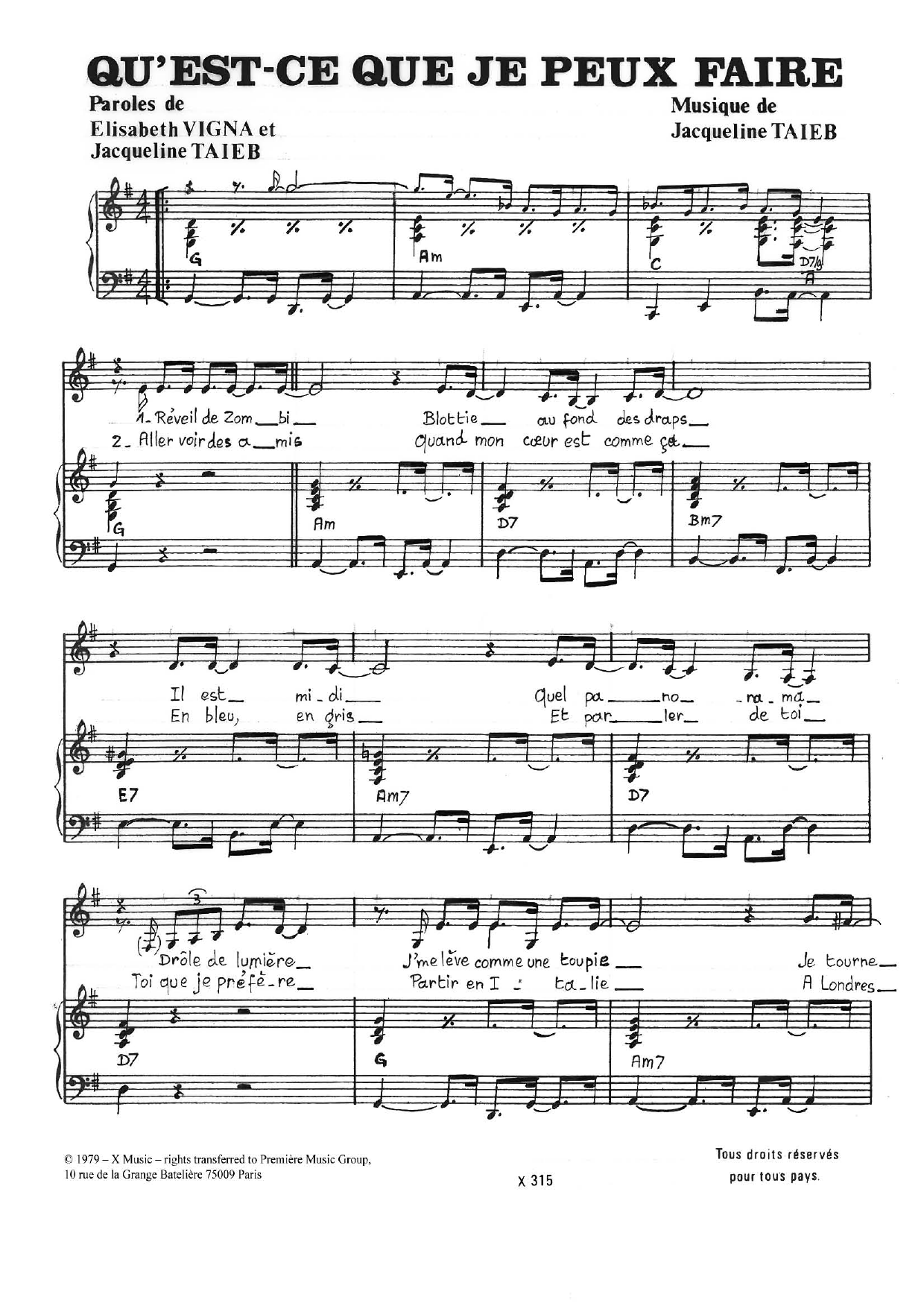 Download or print Jacqueline Taieb Qu'est-Ce Que J'peux Faire sheet music, chords and digital score arranged for Piano & Vocal. This Pop score includes 3 page(s).