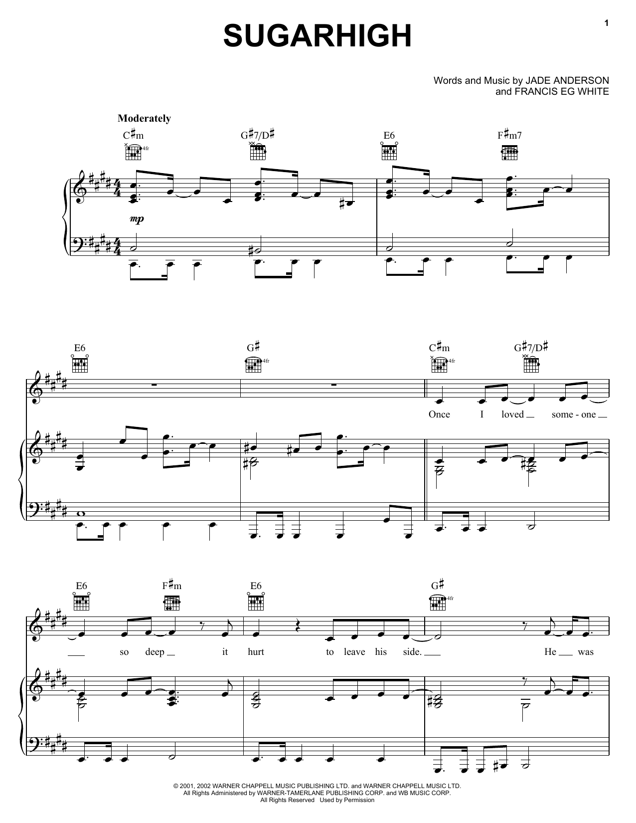 Download or print Jade Anderson Sugarhigh sheet music, chords and digital score arranged for Piano, Vocal & Guitar Chords (Right-Hand Melody). This Pop score includes 8 page(s).