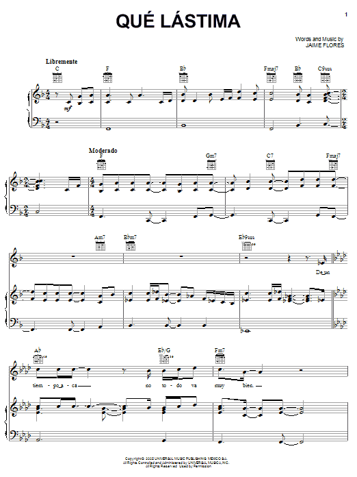 Download or print Jaime Flores Que Lastima sheet music, chords and digital score arranged for Piano, Vocal & Guitar Chords (Right-Hand Melody). This Latin score includes 6 page(s).