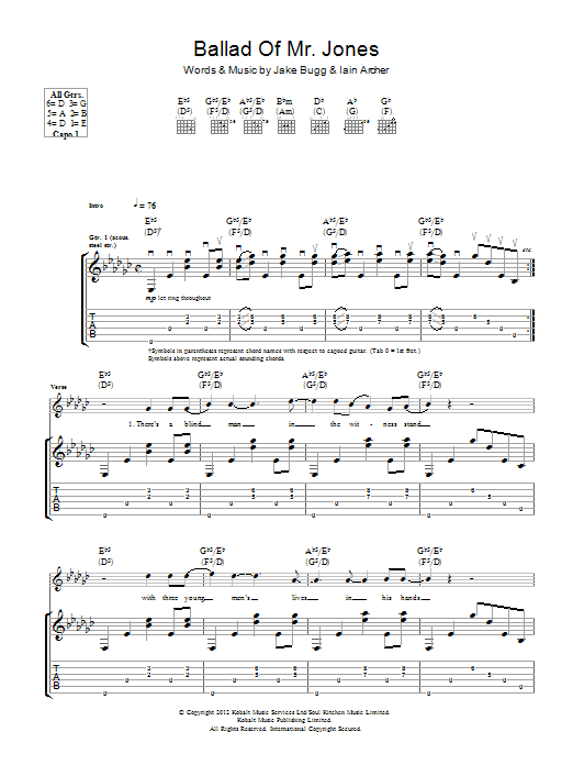 Download or print Jake Bugg Ballad Of Mr. Jones sheet music, chords and digital score arranged for Guitar Tab. This Rock score includes 5 page(s).