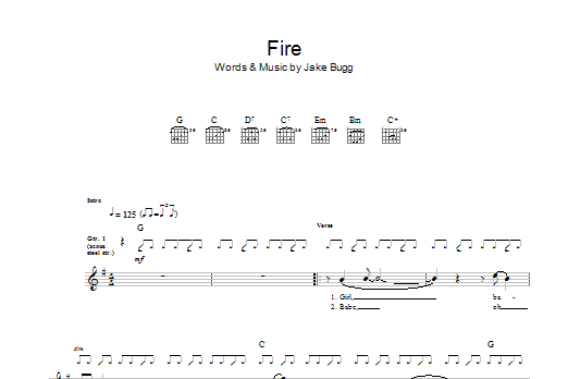 Download or print Jake Bugg Fire sheet music, chords and digital score arranged for Guitar Tab. This Rock score includes 2 page(s).