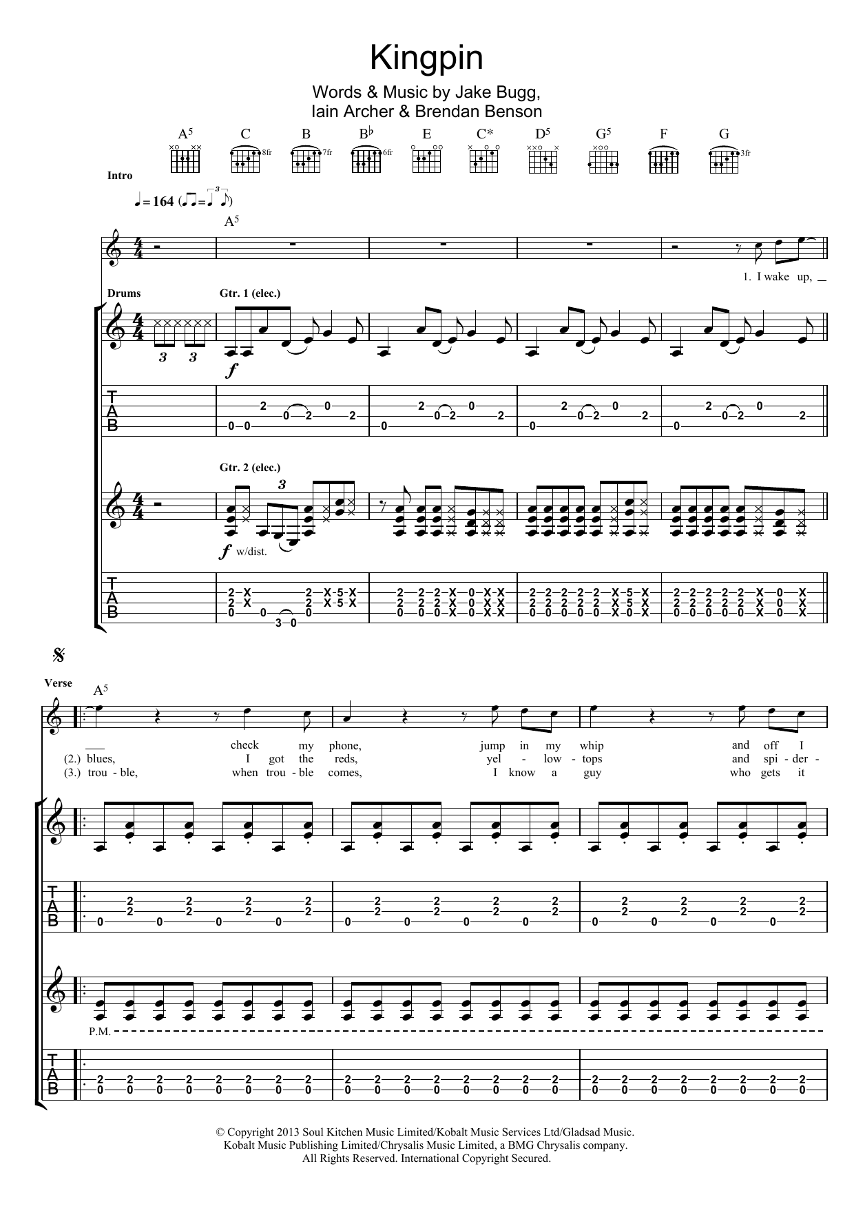 Download or print Jake Bugg Kingpin sheet music, chords and digital score arranged for Guitar Tab. This Rock score includes 8 page(s).